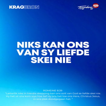 Letterlik niks in hierdie skepping kan ons ooit van God se liefde skei nie. Hy het vir ons kom wys hoe lief Hy ons het toe ons Here, Christus Jesus, in ons plek doodgegaan het. Romeine 8:39 DB
