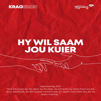 Kyk, Ek staan by die deur en Ek klop. As iemand my stem hoor en die deur oopmaak, sal Ek ingaan na hom toe, en saam met hom eet, en hy saam met My. Openbaring 3:20 AFR20