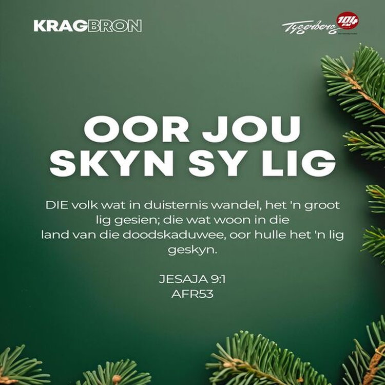 DIE volk wat in duisternis wandel, het 'n groot lig gesien; die wat woon in die land van die doodskaduwee, oor hulle het 'n lig geskyn. JESAJA 9:1 AFR53