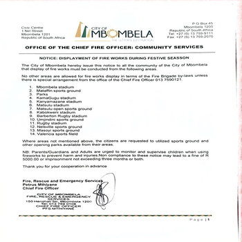 The City of Mbombela has announced that fireworks may only be displayed at designated stadiums, sports grounds, and parks during the festive season. Fireworks are not allowed in any other areas unless special permission is obtained from the Office of the Chief Fire Officer. Parents, guardians, and adults are urged…