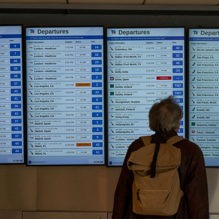 (Picture: A traveller looks at a departures board displaying a cancelled Qatar Airways flight for Doha, amid the U.S.-Israel war with Iran, at Terminal 8 at John F. Kennedy (JFK) International Airport in New York City, U.S., March 2, 2026. REUTERS/Bing Guan. Credit:).